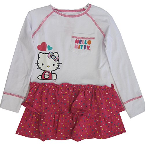 A fancy casual dress with the famous Hello Kitty face printed, a studded bow and glittery texture. The long sleeved dress has a white top with seaming detailing, Kitty print, chest pocket and a fuchsia dotted layered skirt with a little bow at the waist. Your girl will surely enjoy this comfy yet pretty dress.Feature