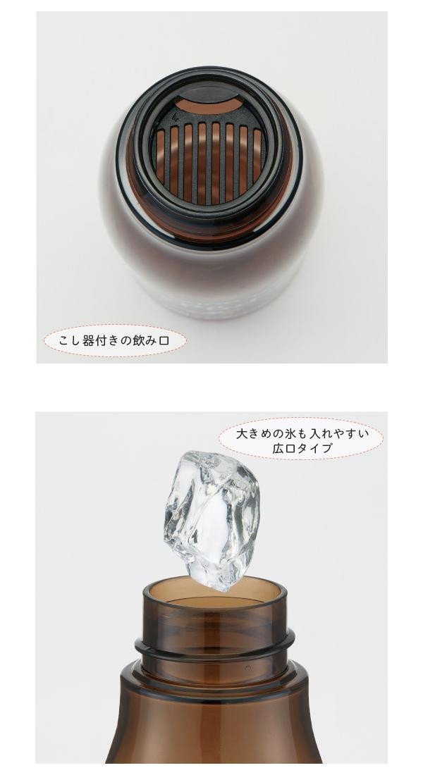 | フタを開けてすぐ飲める直飲みタイプ。ネジ式のフタなので水もれしにくく、持ちやすい形状です。液体だけが飲めるこし器付き飲み口なので、フレーバーウォーターなどにもピッタリ!! |