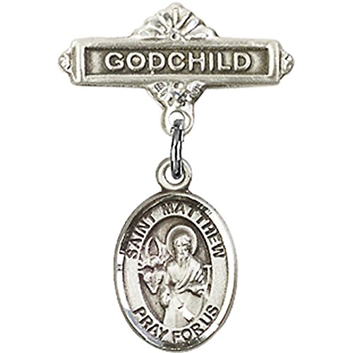 -. Title : Sterling Silver Baby Badge with St. Matthew the Apostle Charm and Godchild Badge Pin 1 X 5/8 inches