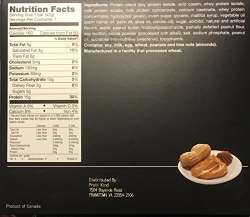 Studio : Proti Kind Publisher : Proti Kind Binding : Health and Beauty Product Description The Proti Kind Peanut Butter Cup Protein Bar is sure to become one of the best high protein diet bars available. If you like Peanut Butter Cups... You'll love this bar! Peanut Butter Cup Ingredients: Protein blend (soy protein isolate, milk protein isolate, acid casein, whey protein isolate, milk protein concentrate, calcium caseinate, whey protein concentrate), hydrolyzed gelatin, glycerin, invert sugar, maltitol syrup, vegetable oil (palm kernel oil, palm oil, shea oil, soybean oil), sugar, water, sorbitol, natural and artificial flavors, peanut butter, fructooligosaccharide, partially defatted peanut flour, soy lecithin, cocoa powder (processed with alkali), salt, sodium phosphate, sucralose (non-nutritive sweetener), tocopherols. Contains: milk, soy, egg, peanuts and tree nuts (almonds). Manufactured in a facility that processes wheat. 0