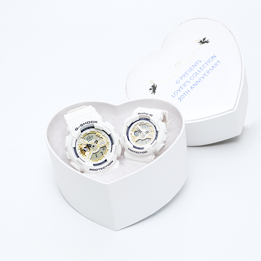 此型號的原型是大錶面 G-SHOCK GA-110,以及設計靈感源自 GA-110 的 BABY-G BA-110。兩款型號均把不同部件結合成複雜圖案。這些全新錶款沿用了元祖型號 LOV96-1 的白色和海軍藍色彩配搭,天使與魔鬼主題亦和元祖型號密不可分,即使兩者的外觀形狀已迥然不同。G-SHOCK 型號設有代表魔鬼利矛的金屬部件,BABY-G 型號則設有象徵天使之心的 金屬部件。兩者象徵愛侶之間無法分割的牽絆。金色則用作紀念此系列邁入 20 週年。