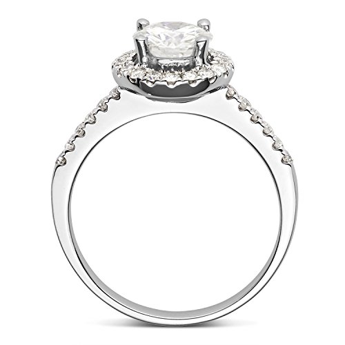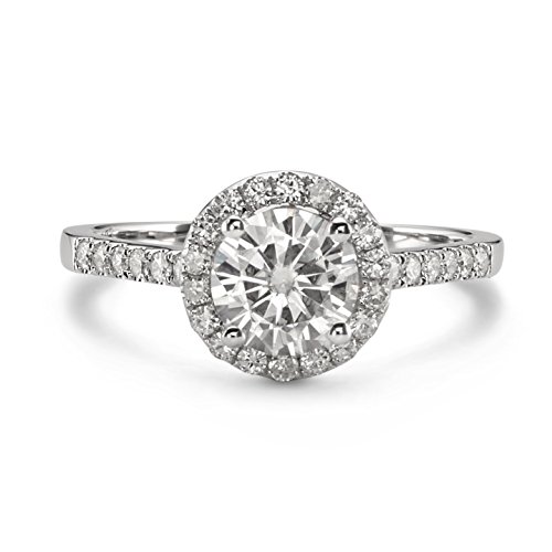 -. Binding : Jewelry -. Brand : Charles & Colvard -. Feature : This charming Forever Brilliant halo ring showcases a 6.5mm round brilliant cut moissanite center gemstone with 30 accent gemstones creating the halo and accented band. / Beautifully crafted in rhodium plated 14K white gold and secured in a four prong setting. / The P.R.Imary gemstone has a Diamond Equivalent Weight (DEW) of 1.00ct (Actual Weight 0.88ct). The total Diamond Equivalent Weight (DEW) is 1.30cttw (Actual Weight 1.11cttw). / Charles & Colvard Forever Brilliant is a near-colorless gemstone in the G-H-I color range that is masterfully hand-faceted by skilled gemstone cutters and carefully hand-polished to reveal its maximum brilliance and enhance its intrinsic fire. / Moissanite created by Charles & Colvard is among the hardest minerals on the planet, more durable than sapphire, ruby, or emerald and has more brilliance than a diamond. It scores 9.25 on the Mohs scale for hardness. -. Label : Charles & Colvard -. Manufacturer : Charles & Colvard -. Model : P376564 -. MPN : P376564 -. PackageQuantity : 1 -. PartNumber : P376564 -. ProductGroup : Jewelry -. ProductTypeName : FINERING -. Publisher : Charles & Colvard -. Studio : Charles & Colvard -. Title : Forever Brilliant White Gold 6.5mm Moissanite Halo Engagement Ring, 1.30cttw DEW By Charles & Colvard