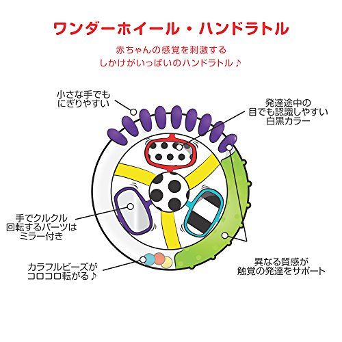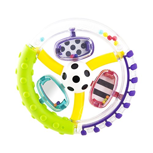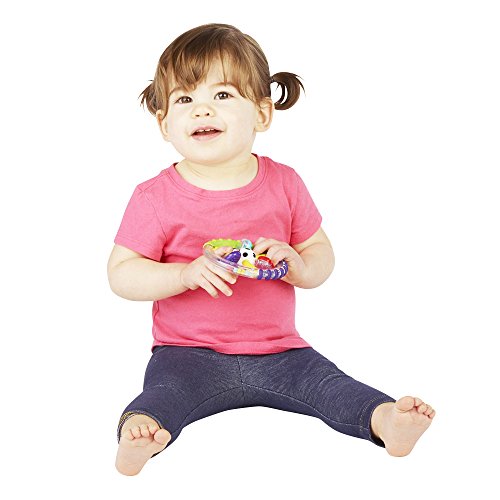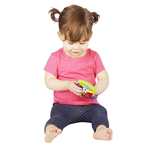 Capture baby's attention with the many features of the Wonder Wheel Ring Rattle. The easy-to-grasp soft-touch handle provides multiple textures for baby to explore and further develop tactile sensitivity. The rattle encourages hands to midline, bringing hands together, which is an important developmental milestone for baby. The spinning center pieces of the rattle provide a higher level of visual tracking and strengthen fine motor skills. Plus, the gentle rattle sound introduces baby to the concept of cause-and-effect.Feature