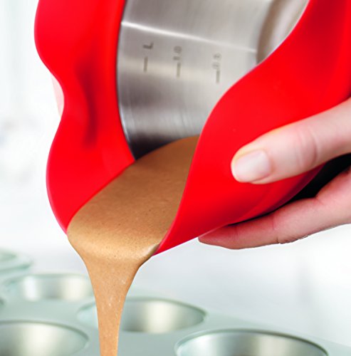 Das rote Extra: Die innovative Silikon-Krempe der kleinen Q! Schüssel gibt sicheren Griff und lässt sich hochklappen. Sie ist Spritzschutz und ein flexibler Schüttrand für punktgenaues Ausgießen und Portionieren. Zudem wird das Abstreifen eines Löffels wesentlich erleichtert. Die integrierte Mess-Skala ist ein weiterer Pluspunkt.