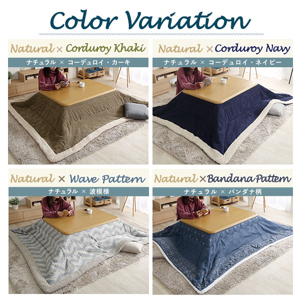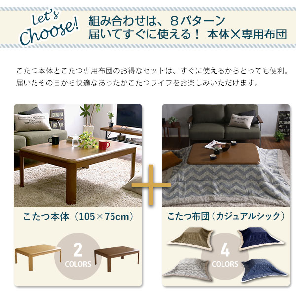 ●木のぬくもりを感じる飽きのこない継脚家具調こたつと、カジュアルシックな4柄から選べる薄掛け布団の2点セット!