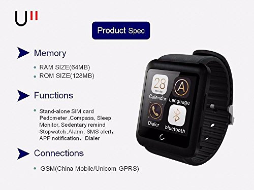 -. Feature : 1.59" 320 * 320 HD Curve Capacitive LCD Touch Screen ;64MB Ram + 128MB Rom ; / Bluetooth Smartwatch UWatch U11 Watch ;Bluetooth 4.0 Version ; / Support remote control, pedometer, sleep monitor, sedentary remind, compass, BT music sync. ;Support alarm, remote capture, BT notification, hand-free calls;Support anti-lost, phone seeking functions ; / Standby Time about 260 hours ;360mAh battery ;Support SIM Card :yes / Language: English,French, Russian, Spanish, Polish, Portuguese, Turkish, Italian, German, Chinese, Hebrew and so on