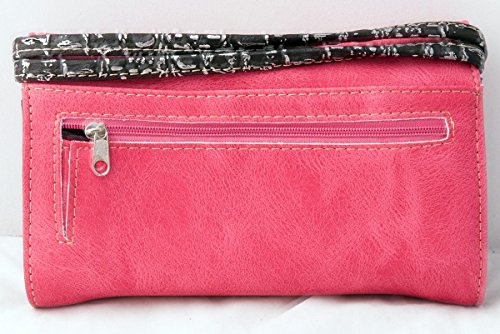 -. Feature : Made from high quality premium faux/imitation leather with decorated with silvertone studs and large eye-catching rhinestone silvertone skull on the front / Single, removable strap to convert the trifold wallet into a wristlet; a single, long removable shoulder/crossbody strap / Flat currency compartments, expanding accordion area for coupons or receipts and a zippered pocket on the inside for coins / Snap closure; 9 slots on the inside for credit cards, ID, or business cards and 3 clear ID windows / 7.5 inches long X 1.5 inches wide X 4.5 inches tall