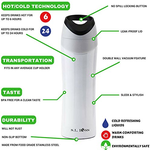 FITS IN ANY AVERAGE CUP HOLDER: S. L. BoSS travel coffee mug is design for ease and comfort, to go with you where ever you go. Carry it on your back pack with ease, fit in your car cup holder and enjoy small sips of water, tea, or coffee on the go.