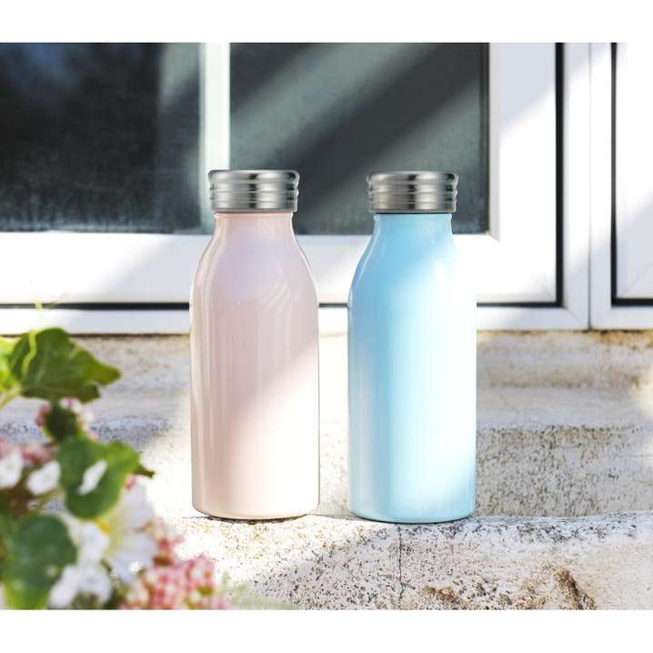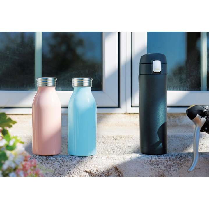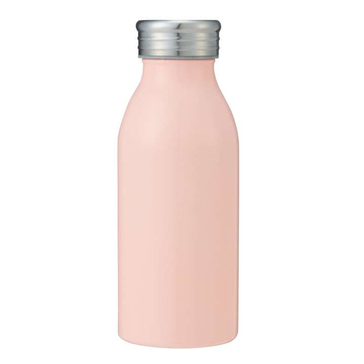●牛乳瓶のようなフォルムがなんだか懐かしさを感じさせる、パステルカラーのステンレスボトル。真空構造なので保冷温もばっちり。
