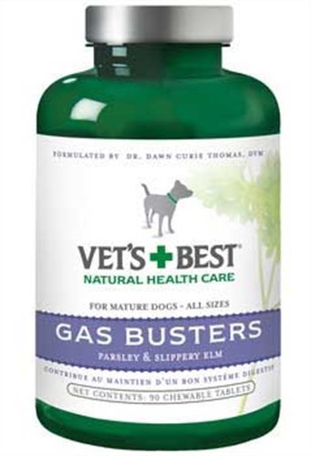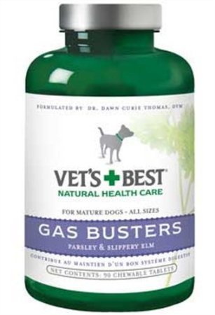 -. Feature : Vet's Best Gas Busters supplement for dogs (90 chewable tablets) helps with the discomfort of occassional gas, bloating, and upset digestive system / Digestive supplement for dogs uses key natural ingredients (parsley, slippery elm bark, ginger root) to help support a healthy gut / Contains Allzyme to provide your dog with enzymes that support healthy digestion / For mature dogs (both large breeds and small breeds); can be given twice daily (follow supplement directions) / Contains 90 chewable tablets; National Animal Supplement Council (NASC) Seal of Approval