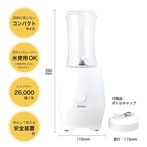●드링크 캡에 붙여 돌아가 곧바로 마실 수 있다●갑자기 만들어 갑자기 정돈할 수 있다●한 사람분에 정확히 좋다.콤팩트 믹서●그대로 마실 수 있는 보틀형●하이 파워26,000회/분●본체,보틀,블랜더고, 드링크 캡으로 나뉘기 때문에 씻기 쉽습니다●보틀이 본체로는 기다리고 없으면 회전하지 않도록 안전장치가 붙고 있습니다●버튼을 만의 간단 조작입니다●키친으로도 쓰이는 콤팩트크기입니다●사양●상품크기:W115×D115×H280mm●전원:AC100V,50/60Hz●소비전력:300W●정격시간:1분●코드의 길이:약1.0m●부속품:블랜더고, 보틀,드링크 캡각1개