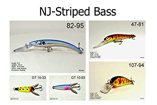 -. Feature : We have done the research and so you don't have to, We have lures chosen in packs specifically for your state and fishing pleasure / Please select your state to get the pack of lures chosen by our staff to catch striped bass in your area / These packs are of great value giving you savings of up to 50 percent compared to other name brand lures, Makes a great gift / Akuna is a manufacturer of quality fishing products, We offer many unique colors and convenient packs for your fishing enjoyment, The lures in these packs are intended for freshwater use only / Click ASK OWNERS in Q&A section below for recommendations, usage, etc. Share with us your fishing stores, We would love to hear from you