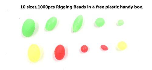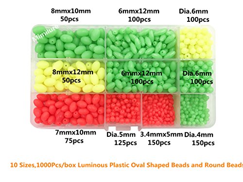 -. Feature : 1) Color: Green,Yellow,Red. NOTE: Only Green Beads Glow! / 2) Size:10 sizes,1000Pcs/box Luminous Plastic Oval Shaped Beads and Round Beads.Multiple Sizes for Multiple Fishing Situations. / 3) Luminous beads added attraction while night fishing or deep water fishing.Soft Plastic Oval Shaped can reduce resistance,and protect the head of fishing rod and float chamber. / 4) Good for Deep Drop Rigs, Rigging Trolling Lures,Stream, Pool, Lake, River Fishing and So On. / 5) Mimilure Remind: please be careful with use and keep out of reach of children.