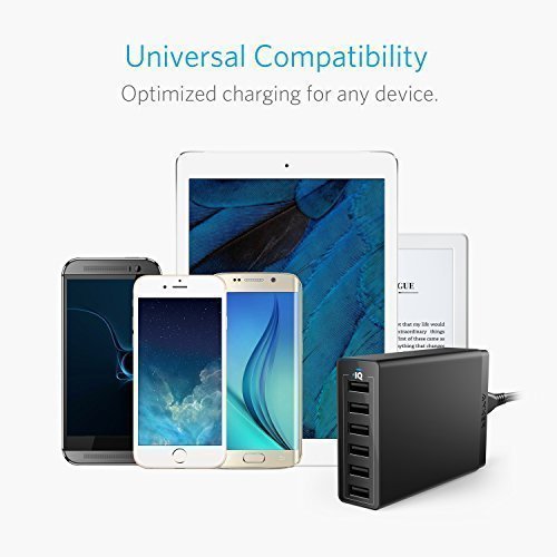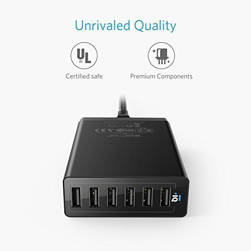 AMERICA'S LEADING USB CHARGING BRAND - Faster and safer charging with our leading technology - 10 million+ happy users and counting Anker PowerPort 6 Full speed charging for all of your devices Fast Charging Technology Exclusive to Anker, PowerIQ and VoltageBoost combine to ensure the fastest possible charge speed (Qualcomm Quick Charge 2.0 not supported. For QC 2.0 charging, please see Anker's 18W USB Wall Charger). Ultra Powerful Six ports pump out 60 watts of power, enabling simultaneous multi-device charging. High Efficiency Rated DOE 6 highly energy efficient by the US Dept. of Energy. Super Compact The Anker PowerPort 6 is one of the most compact multi-port USB chargers on the market. MultiProtect Safety System Surge protection, temperature control and more advanced safety features keep you and your devices safe. UL Certified Built with industry grade materials and premium circuitry, this product meets the rigorous safety standards of Underwriters Laboratories. For Optimal Use: - Use your original cable or a third-party certified one (such as MFi). - Compatible with iPhones and iPads, Android smartphones and tablets (including the Nexus 7), the new 12\" MacBook (via USB-C cable) and other USB-charged devices except for the iPod nano, iPod Classic, iPod Shuffle, HP TouchPad, Dell Venue 11 Pro and Asus tablets Note: If a port isn't working properly, it may be because your device has triggered the protective internal safety switch. In order to reset the switch, unplug all cables (including power cable) for five minutes and retry.Feature