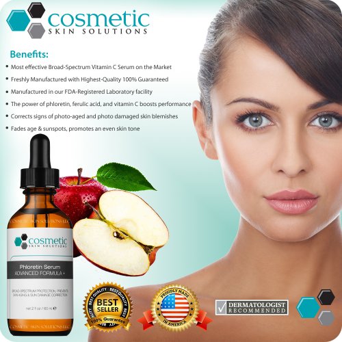 - Feature : All Cosmetic Skin Solutions products' are Manufactured in our FDA-Registered laboratory facility under strict US FDA guidelines. Made in the USA. No Parabens. No Oils. Cruelty-Free. / This Best Selling topical antioxidant Phloretin Serum + Ferulic acid + Hyaluronic acid is the highest-quality Phloretin Serum available in today's cosmetic marketplace. / This Best Selling Phloretin Serum is a super antioxidant representing a brand new class of preventative and corrective treatments combining 0.5% Ferulic acid (potent antioxidant found in cell walls of plants) with 10% pure L-Ascorbic acid (Vitamin C), 2% Phloretin and hyaluronic acid to fight free radicals and correct photo damage to skin. / State-Of-The-Art technology using a diverse formulation lightens, fades age & sun spots, & promotes an even skin tone. / The manufacturing date and time a product is applied are both critical components which define the performance level a topical antioxidant treatment will provide to the skin. Cosmetic Skin Solutions LLC manufactures our entire line of topical antioxidant treatments once per week to ensure absolute freshness and to optimize efficacy prior to use.