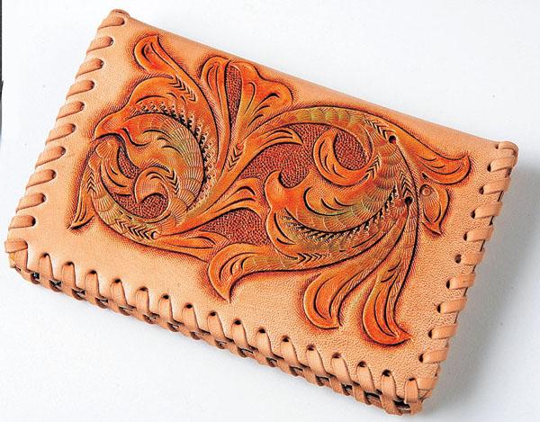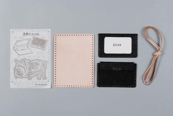 かがり穴のあいている革キット。スタンピング、カービング、染色などが自由にできます。