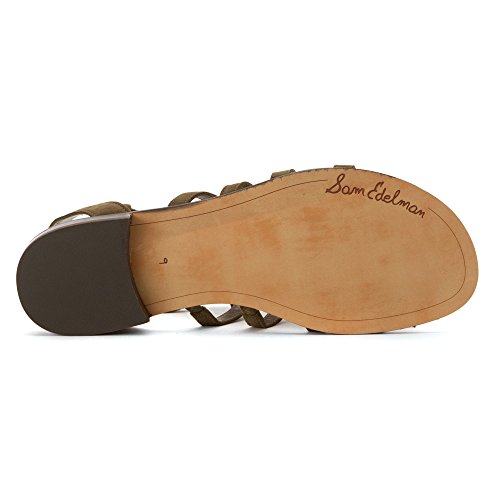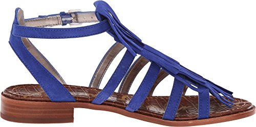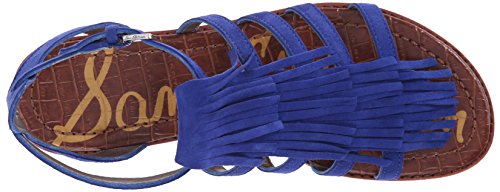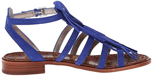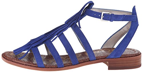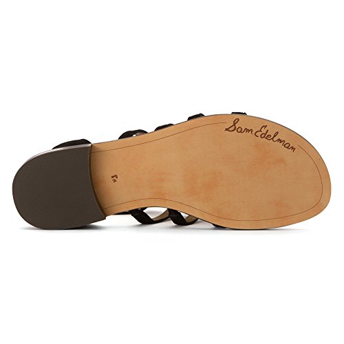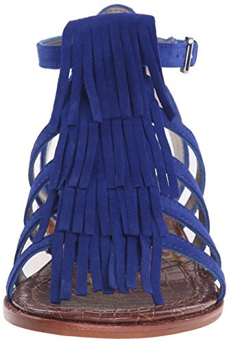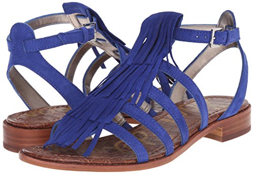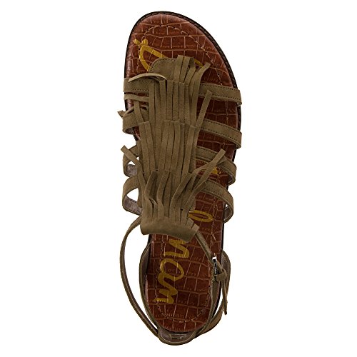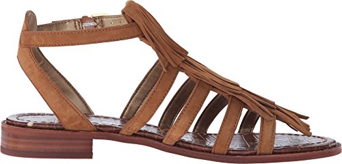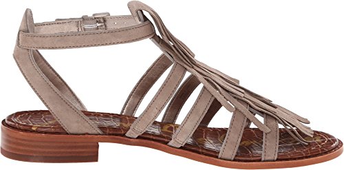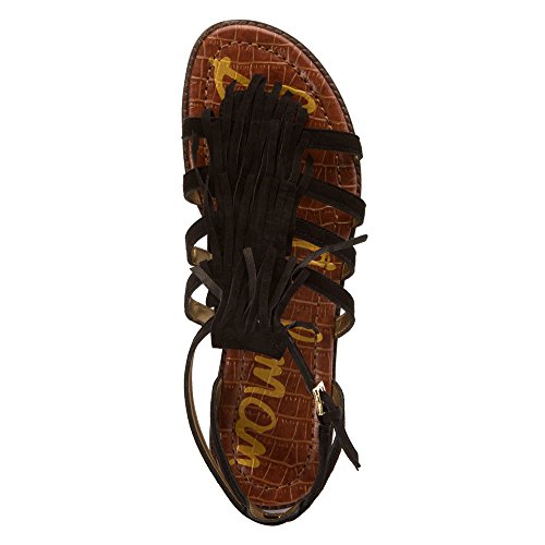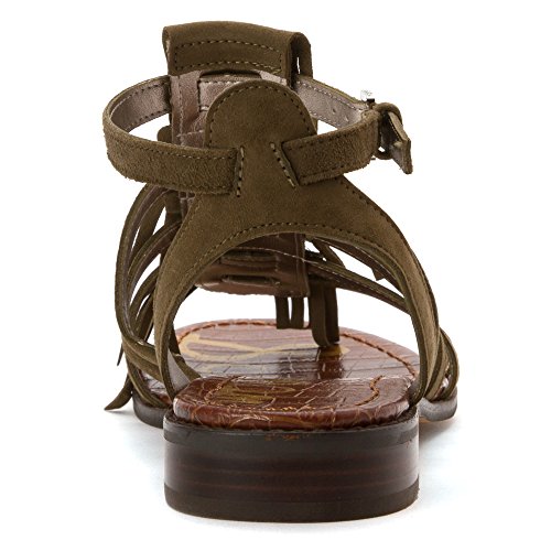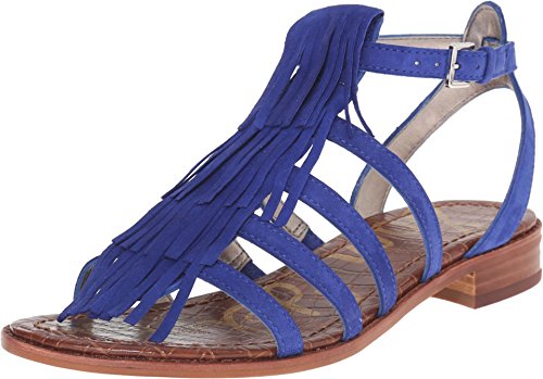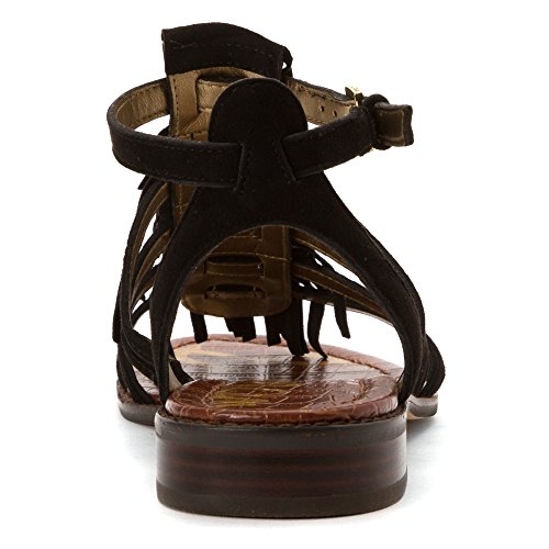Gladiator-inspired sandal featuring cagey leather upper with fringe center strap and ankle strap with buckle closure