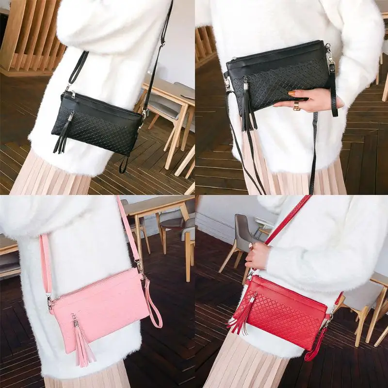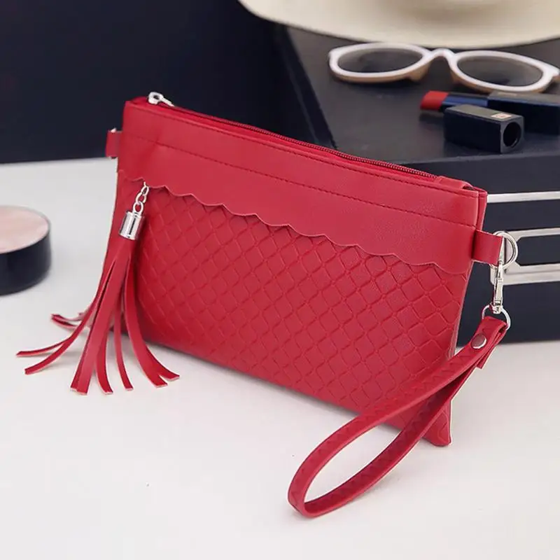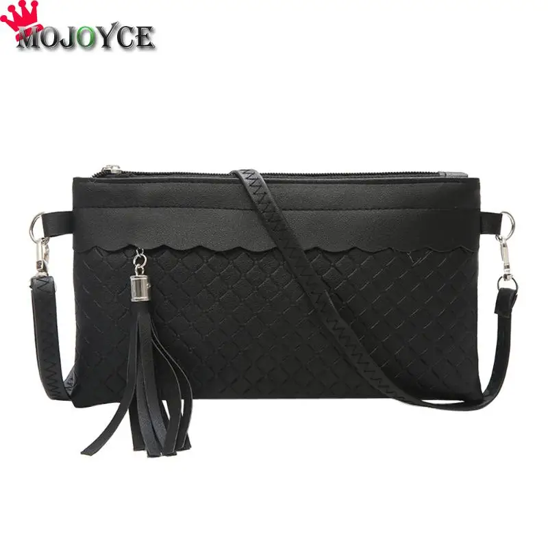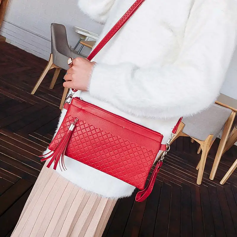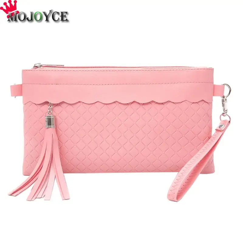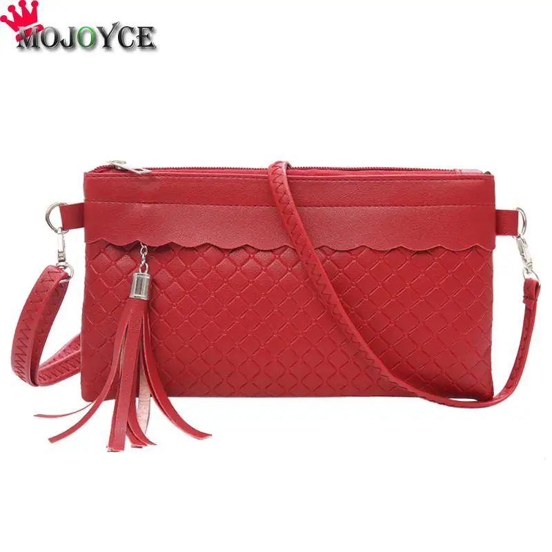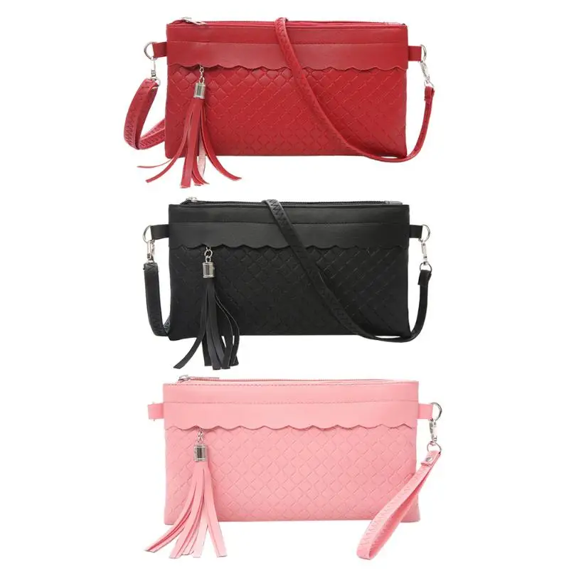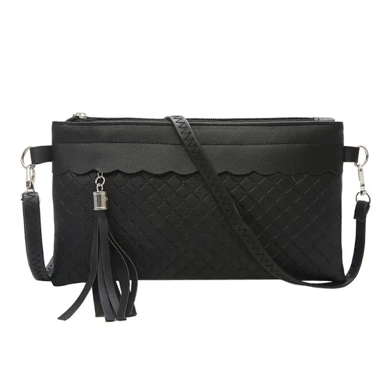 女性タッセルshoudlerハンドバッグpuレザーソリッド織りクラッチメッセンジャーエンベロープバッグ
