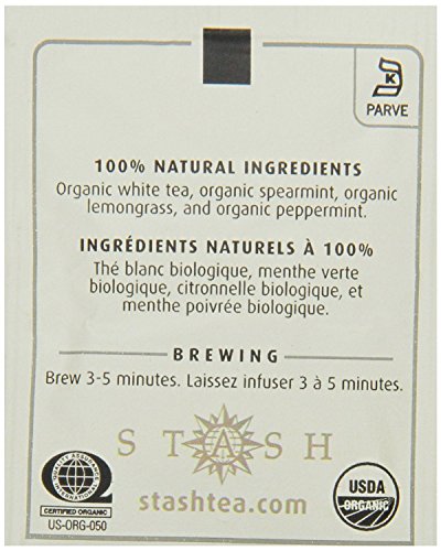 -. Binding : Grocery -. Brand : Stash Tea -. Feature : Lively combination of white tea, mints, and a touch of lemongrass / Certified organic / Makes for the perfect start to the morning or afternoon warmup / Made with 100% natural ingredients / Blended in the USA with natural ingredients from around the world. -. Label : Stash Tea -. Manufacturer : Stash Tea -. Model : 79470 -. MPN : 79470 -. NumberOfItems : 1 -. PackageQuantity : 1 -. PartNumber : 79470 -. ProductGroup : Grocery -. ProductTypeName : GROCERY -. PublicationDate : 2013-07-18 -. Publisher : Stash Tea -. ReleaseDate : 2013-07-18 -. Studio : Stash Tea -. Title : Stash Tea Organic Tea Bags in Foil, White Tea with Mint, 100 Count