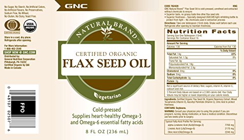 -. Binding : Health and Beauty -. Brand : GNC -. Feature : Superior taste, no grassy taste like other flax seed oils / Superior freshness 0 Specially designed UVA/UVB light-inhibiting bottle to protect from light - No Chemicals in extraction process / alpha-Linolenic Acid (ALA)(Omega-3) - 7700 mg / Linoleic Acid (LA)(Omega-6) - 2170 mg / For More Information About Whole Herbs Vs. Extracts, Click Here -. ProductGroup : Health and Beauty -. ProductTypeName : HEALTH_PERSONAL_CARE -. Title : Natural Brand Certified Organic Flax Seed Oil