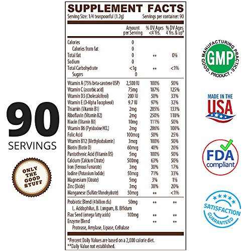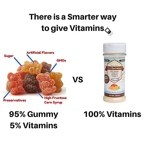 Undetectable Taste on Food: Perfect for filling nutritional gaps in picky diets. Just a couple of secret shakes can boost the nutrition of practically any meal with no negotiating, scrunchy faces or temper tantrums.;No Added Yucky Stuff: We care about your kids, so you won't find the sugar, fillers, colors, preservatives, or other ingredients most kids' gummies & chewables have. (Scroll to description for full list.);4-in-1 Supplement: More than a multivitamin with 4 billion probiotics, essential omega 3's, digestive enzymes, iron & D3. The most complete children's supplement available.;Doctor Developed: Formulated to support a healthy immune system, support brain function & concentration, aid in proper digestion & contribute to stronger bones.;3 Times the Quantity + Money-Back Guarantee: Each bottle provides a 90-day supply for the same price most charge for 30 days. Give these flavorless vitamins a try. If your kids turn up their noses, we'll refund your purchase.Feature