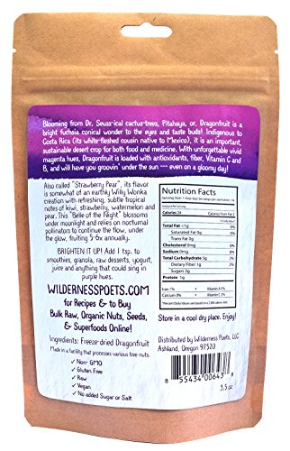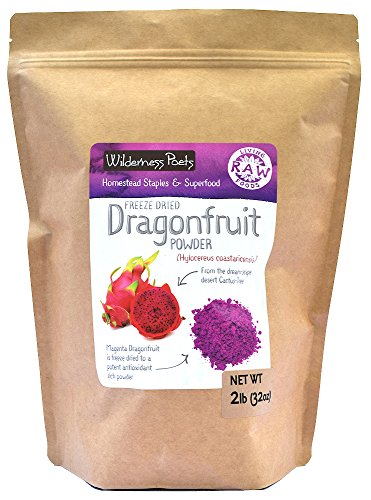 Hylocereus coastaricensis Raw - Living Foods Homestead Staples & Superfood Non-GMO Gluten Free Raw Vegan No Added Sugar or SaltFrom the dream-scape desert Cactus-TreeMagenta Dragonfruit is freeze dried to a potent antioxidant rich powder.Blooming from Dr. Seuss-ical cactus-tree, Pitahaya or, Dragonfruit is a bright fuchsia conical wonder to the eyes and taste buds! Indigenous to Costa Rica (its white-fleshed cousin native to Mexico), it is an important, sustainable desert crop for both food and medicine. With unforgettable vivid magenta hues, Dragonfruit is loaded with antioxidants, fiber, Vitamin C and B, and will have you groovin' under the sun --- even on a gloomy day!Also called "Strawberry Pear", its flavor is somewhat of an earthly Willy Wonka creation with refreshing, subtle tropical notes of kiwi, strawberry, watermelon and pear. This "Belle of the Night" blossoms under moonlight and relies on nocturnal pollinators to continue the flow, under the glow, fruiting 5-6x annually.Feature
