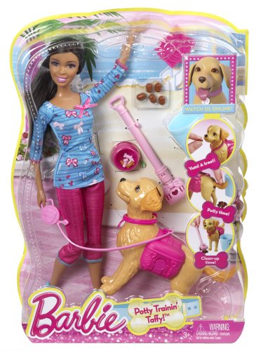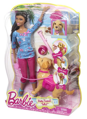 -. Feature : Nikki doll shows how much she loves her pets by taking good care of them / With the Barbie Potty Training Taffy set, you can help Nikki doll feed and clean up after her pets / This pet actually pees and poops! / Includes Nikki doll and her sweet dog, Taffy, complete with dog-food-toting pack / Additional accessories include doggie food dish with treats, a pooper scooper, trash can and more!