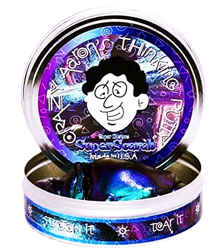 -. Binding : Toy -. Brand : Crazy Aaron's -. EAN : 0802872632262 -. Feature : Super Scarab offers incredible color shift from blue into purple right through to red and copper. / Its smooth aqua tones dance in the light and hypnotize the eye. Soothe your senses with this tranquil putty. / n ancient Egypt, the scarab beetle was prized for its color that transcended the natural world. / Pull your Super Scarab very thin and it is virtually transparent. / Stretch and knead to see the shine come back to life! Made in the USA -. IsAdultProduct : 0 -. ItemPartNumber : SC003 -. Label : Crazy Aaron's -. Manufacturer : Crazy Aaron's -. ProductGroup : Toy -. ProductTypeName : TOYS_AND_GAMES -. Publisher : Crazy Aaron's -. Studio : Crazy Aaron's -. Title : Super Scarab Super Illusions Crazy Aaron's Thinking Putty New small 2" tin For Ages 3+ -. UPC : 802872632262