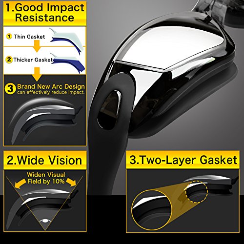 SAFE AND COMFORTABLE: Commit to let swimmer’s eyes feel comfortable in water as they do in normal state. The Double-Layer eco-friendly silicone gaskets seal your eye sockets snugly, to prevent leakage while minimize the frontal resistance in water. The Impact-Resistant polycarbonate lenses provide better eye protection, which are also coated with anti-fogging treatment to let you have prolonged clear vision
