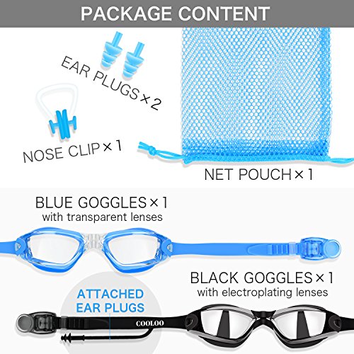 FUNCTIONAL IN VARIOUS CONDITIONS: One set fits all your needs. Transparent lenses provide sharp and clear visibility for indoor swimming. Electroplating lenses protect your eyes from UVA/UVB exposure and reduce the sun glare when swimming outdoors. The connected ear plugs offer protections against germs or other contaminants that may hurt your health