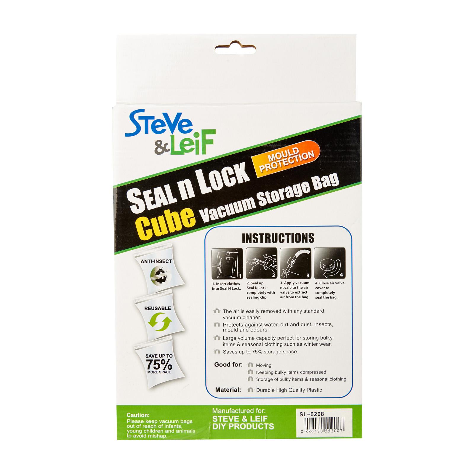 Steve u0026amp; Leif's Seal n Lock Cube Vacuum Storage Bag is durable and perfect for your storage needs which save up to 75% more space! Simply lay flat and vacuum the excess air from the bag and you are ready to go. Keep all your bulky items compressed to make more room for more items in your cabinet! Available in 2 sizes.