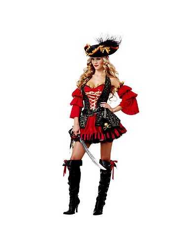 - Feature : The Spanish Pirate is an affluently accessorized dress featuring a sweetheart neckline with gold ribbon lacing, an attached black gold vest, buckled belt, and a flared skirt. / Included: Dress, Hat, Feather, Sleeves, Belt, Pouch / Material/Fabric: 100%Polyester / Spot Clean Only