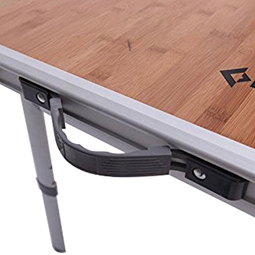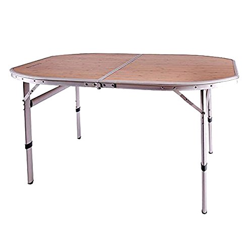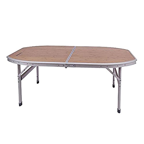 KINGCAMP Oval Bamboo Table is a new multifunctional bamboo table. The oval design is fashionable, eye-pleasing, elegant and practical. This table uses a homobaric special pure bamboo board instead general MDF board, and strengths the load-bearing. The two adjustable heights adapt by the table legs apply to any environment. The pure bamboo has the ability of anti-UV and waterproof, and it is very convenient to clean and wash. You can also fold it into the suitcase shape, which makes it easy to carry and store. But please cautious that things on the table should not beyond 110pounds.
