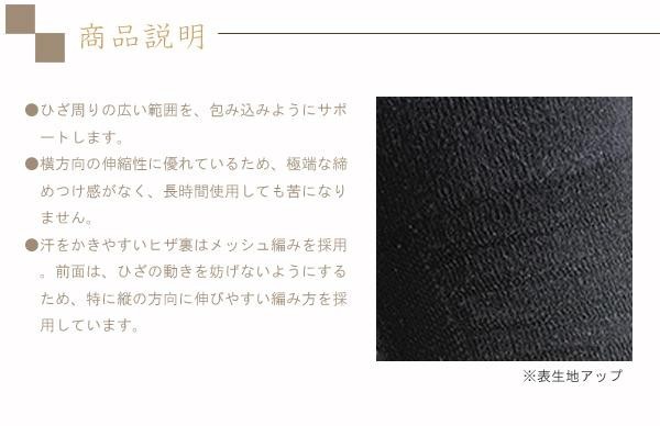 | 横方向の伸縮性に優れているため、極端な締めつけ感がなく、長時間使用しても苦になりません。汗をかきやすいヒザ裏はメッシュ編みを採用。前面は、ひざの動きを妨げないようにするため、特に縦の方向に伸びやすい編み方を採用しています。 |