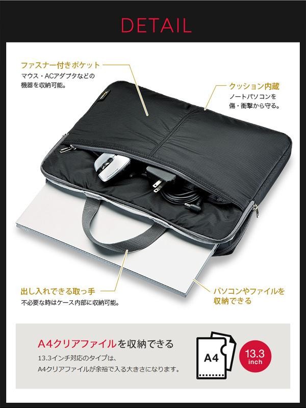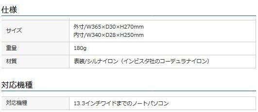 | 軽くて耐久性が高いコーデュラナイロンを使用しています。しなやかで滑らかな表面でカバンへの出し入れもストレスなくスムーズに行えます。アダプタやマウスなどが収納できるファスナーポケット付きです。 |