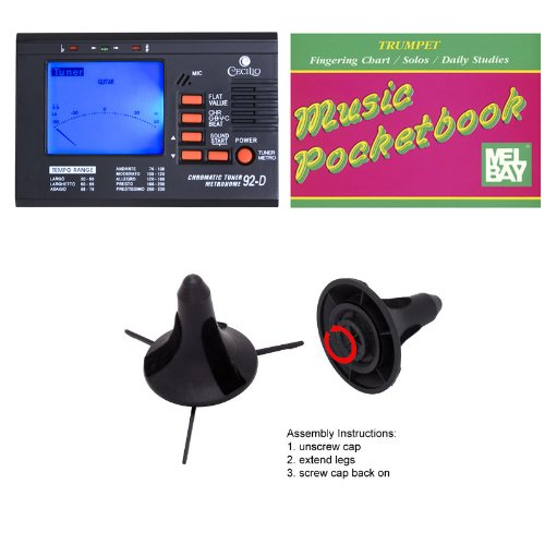 Includes: Cecilio 92-D chromatic tuner, case, pocketbook, bottle of valve oil, soft polishing cloth, a pair of white gloves, and a foldable pocket trumpet stand that is stored inside the bell
