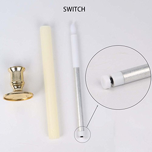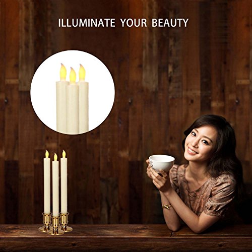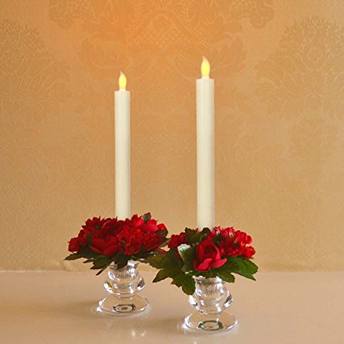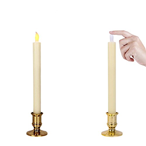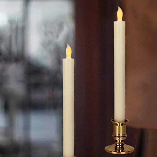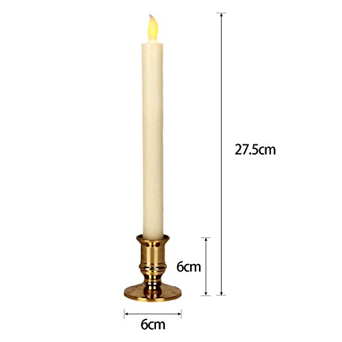 Studio : Micandle Publisher : Micandle Binding : Kitchen Product Description Size: Candles: 0.87" (D) * 10" (H); Holder: 2.36" (D) * 2.36" (H). Material: real wax, high quality material guarantee. Light color: yellow, create a comfortable and warm Surface color: white and gold Battery: 2 AAA batteries required (included and installed). Battery life: 120 hours. Quantity: 2 LED taper candles per pack