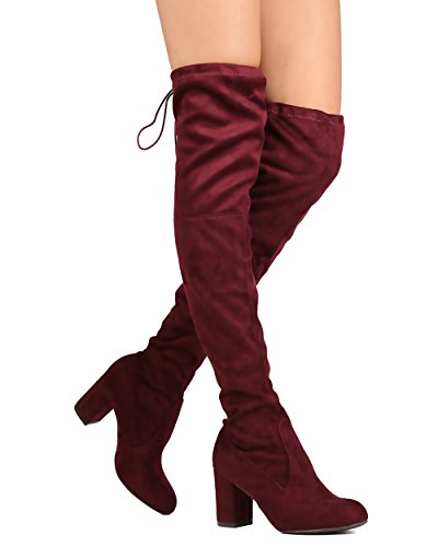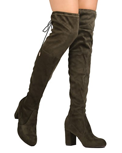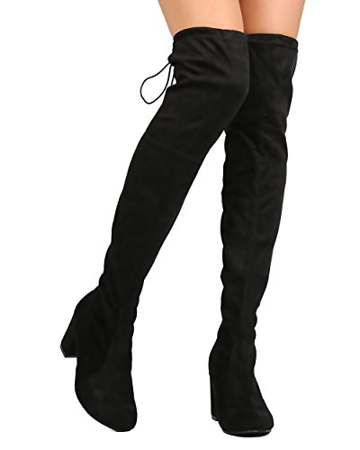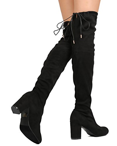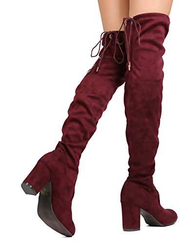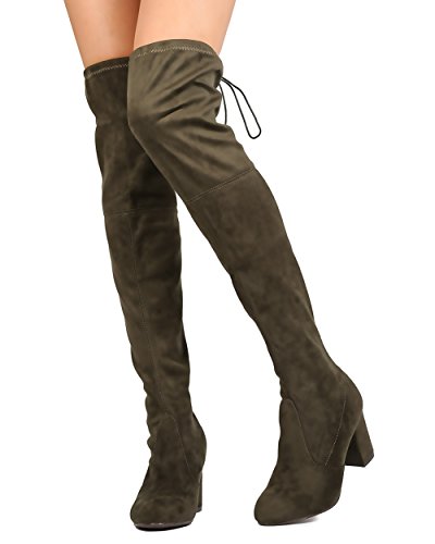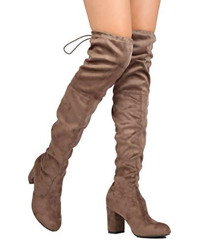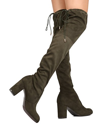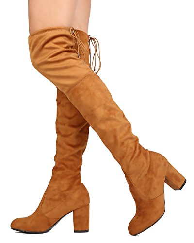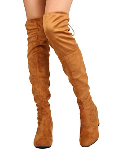 Product Description Designed with faux suede upper, round toe, stitch accents, thigh high rise, hind tie with fastener, covered chunky heel, and pull up design. 0