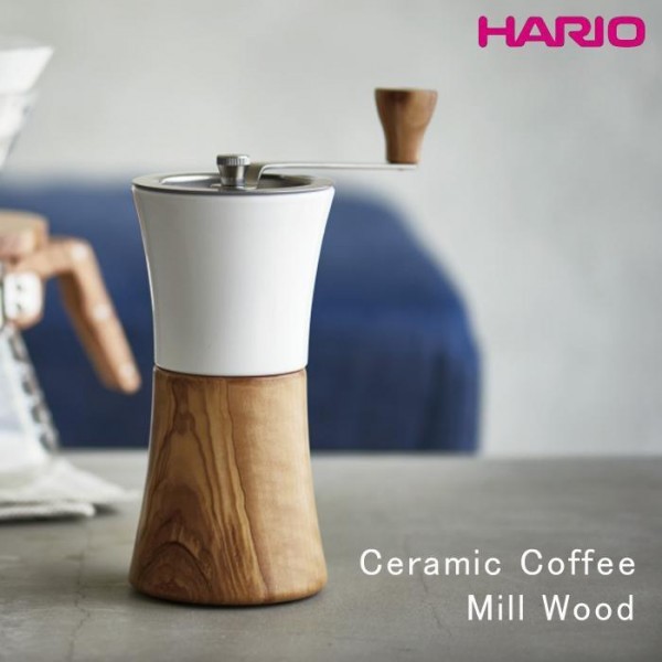 | セラミック製ホッパーにオリーブウッドの粉受けを組み合わせた、ナチュラルテイストのコーヒーミルです。調節つまみを回して粗さの調節ができます。 |