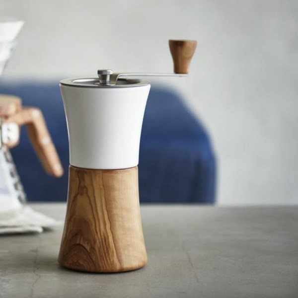 セラミック製ホッパーにオリーブウッドの粉受けを組み合わせた、ナチュラルテイストのコーヒーミルです。調節つまみを回して粗さの調節ができます。 |