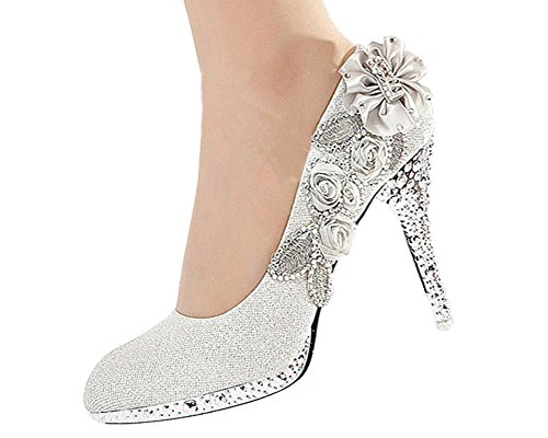 -. Title : Getmorebeauty Women's Silver Lace Flower Pearls Closed Toes Wedding Shoes