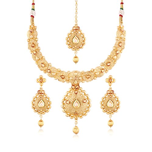 Traditional designer Necklace Set with high gold finish. It comes with matching earrings and maang tikka. This set is perfect for any Indian occassions.