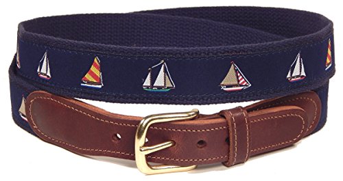 -. Brand : Preston Leather -. Color : Blue -. Department : mens -. Feature : Leather tabs / Brass buckle / Ribbon has a repeating pattern of four differently colored sailboats, on a navy blue background, sewn into a 1 1/4 inch wide navy web backing. -. ProductGroup : Apparel -. ProductTypeName : APPAREL -. Title : Preston Leather "Four Sailboats" Belt, Navy Blue