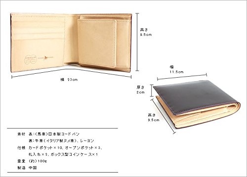 -. Feature : FLYING HORSE(フライングホース) / ブラック、ブラウン、バーガンディ、ネイビー、グリーン、ゴールド、シルバー / その希少なこと、また輝くような光沢を持つことから、「革のダイヤモンド」と称されるコードバン。その最高級の革を使い、 便利な機能をプラスして作った、二つ折り財布です。【サイズ / 重さ】縦:約9.5cm / 横:約11.5cm / 厚さ:約2cm / 約100g【仕様】カードポケット×10、オープンポケット×3、札入れ×2、ボックス型コインケース×1【素材】表地/馬革(日本製コードバン)、裏地/牛革(イタリア製ヌメ革)、レーヨン【製造 】中国