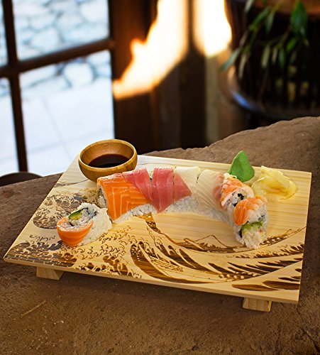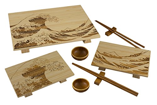 Studio : Totally Bamboo Publisher : Totally Bamboo Product Description Totally Bamboo's sushi sets are exquisitely crafted from sustainable bamboo. Laser engraved on the plates Is the iconic Japanese wood block print design which will delight you with the attention to detail. So pretty you'll almost hate to cover them with food! Whether you enjoy take-out sushi or homemade, this serving set from Totally Bamboo will enhance your dining experience - and it makes a great gift. Exquisitely crafted of sustainable Bamboo, this light colored set features a laser engraving that is an iconic Japanese wood block print design. Set includes one 7-3/4" x 11" Serving Board, two 5-1/4" x 7-3/4" Plates, two 2" Mini Bowls, two sets of Twist Chopsticks and two Chopstick Rests. 0