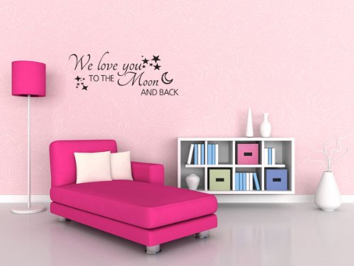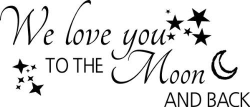 -. Binding : Kitchen -. Brand : WallDecalQuote -. Color : Black -. EAN : 0632930206902 -. Feature : Wall Decal Color: Black / Size: 28" Wide x 12" High / Made from 7 year High Quality outdoor/indoor vinyl / Can be used on wall or any other smooth surface / self adhesive wall decal - easy to setup -. IsAutographed : 0 -. Label : WallDecalQuote -. Manufacturer : WallDecalQuote -. Model : 6077512 -. MPN : V137 -. PartNumber : V137 -. ProductGroup : Home -. ProductTypeName : HOME -. Publisher : WallDecalQuote -. Size : 28" Wide x 12" High -. Studio : WallDecalQuote -. Title : We love you to the Moon and back wall quote wall sticker wall decals quotes -. UPC : 632930206902
