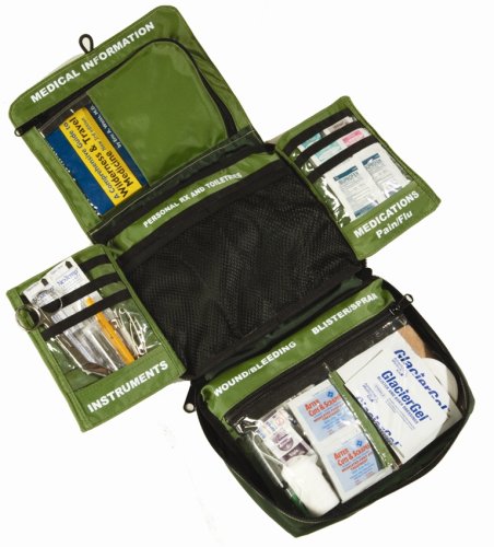 -. Feature : Large amount of medications for stomach ailments, Rice-based Oral Rehydration Electrolite Mix, A Comprehensive Guide to Wilderness and Travel Medicine, TSA Approved 3-1-1 Bag for liquids being carried on airplanes, Moleskin and GlacierGel for blister prevention and treatment, mesh pocket for storage of personal items, Easy Care First Aid System - contents organized by injury or ailment / Adhesive Bandage Fabric 1" x 3" 10, Adhesive Bandage Fabric Knuckle 4, Conforming Gauze Bandage 2 1, Sterile Gauze Dressing 2" x 2" pkg.2 3, Sterile Gauze Dressing 4" x 4" pkg.2 3, Sterile Non-Adherent Dressing 3" x 4" 2 / GlacierGel Large Oval 1, GlacierGel Small Rectangular 1,Moleskin Pre-Cut Shaped 11 / Pencil 1, Safety Pins 3, Scissors w Blunt Tip Bandage 1, Splinter PickerTick Remover Forceps 1, Disposable Thermometer2 / Comp. Guide to Wilderness Travel Medicine 1, Patient Assessment Form 1, Visual Communication Tool 1