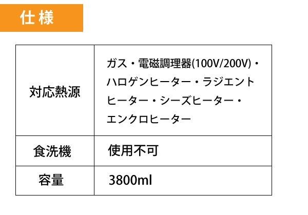 | 仕様 | 対応熱源:ガス・電磁調理器(100V/200V)・ハロゲンヒーター・ラジエントヒーター・シーズヒーター・エンクロヒーター 食洗機:使用不可 容量:3800ml |