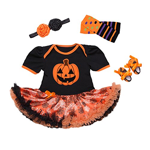 -. Brand : GP.R.Ince -. Department : unisex-baby -. Feature : Quality Material - Made from skin-friendly, soft, smooth and micro elasticity cotton weave. / Feature - Short sleeve, round neck dress with pumpkin and spider web pattern is cute dress-up. / Perfect Gift - Perfect Halloween/birthday gift for 0 months to 2 years old baby girl / Note - Because the computer or smartphone different can have the chromatic aberration, Please forgive! -. Model : US-lcl20170911-1-01 -. ProductGroup : Apparel -. ProductTypeName : BABY_COSTUME -. Title : 4Pcs Outfits Baby Girls Halloween Party Tutu Dress Headband Leg Warmers Flower Shoes