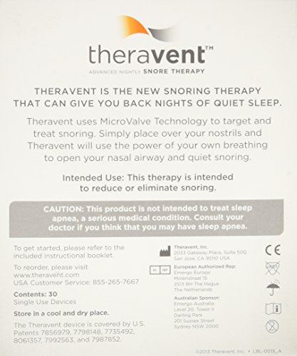 -. Binding : Health and Beauty -. Brand : Theravent -. Department : Unisex Adult -. EAN : 0789015437666 -. Feature : Apply nasal strips directly to your nose to stop the snoring / Comfortable and easy to use / Nasal strip technology clinically proven to reduce snoring by 76% / Stop snoring immediately - 30 day money back guarantee! / No machines, no drugs, no mouthpieces, no sprays -. IsAdultProduct : 0 -. Label : Theravent Inc. -. Manufacturer : Theravent Inc. -. MPN : 063666 -. NumberOfItems : 1 -. PackageQuantity : 1 -. PartNumber : 063666 -. ProductGroup : Health and Beauty -. ProductTypeName : HEALTH_PERSONAL_CARE -. Publisher : Theravent Inc. -. Studio : Theravent Inc. -. Title : Theravent - Stop Snoring the Easy Way (30 Pack) -. UPC : 863980000015